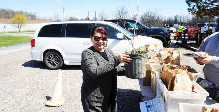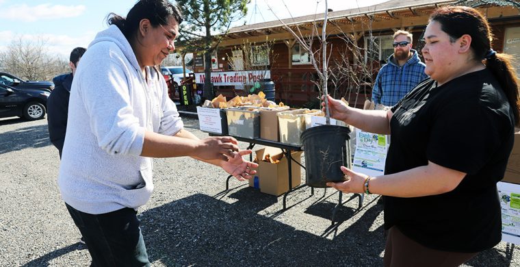 Turtle Island News annual Earth Day tree give away a tree…ific success! Photos Jim C. Powless There were hazelnut trees, sugar maples, apple trees and lots and lots of smiles as Six Nations turned out in droves to mark Turtle Island News’ 27th annual Earth Day tree-give away! The annual Earth Day event turned Turtle Island News’ parking lot into a forest with both fruit trees and of course what has become an Earth Day staple hundreds of white pines and cedars! A smiling Karen Russell dropped by Turtle Island News armed with a big smile. “They gave me a cedar tree,” she said. “I think it is wonderful. It could not be better. They are very giving, helpful and informative. If you have questions, they have all the answers.”…